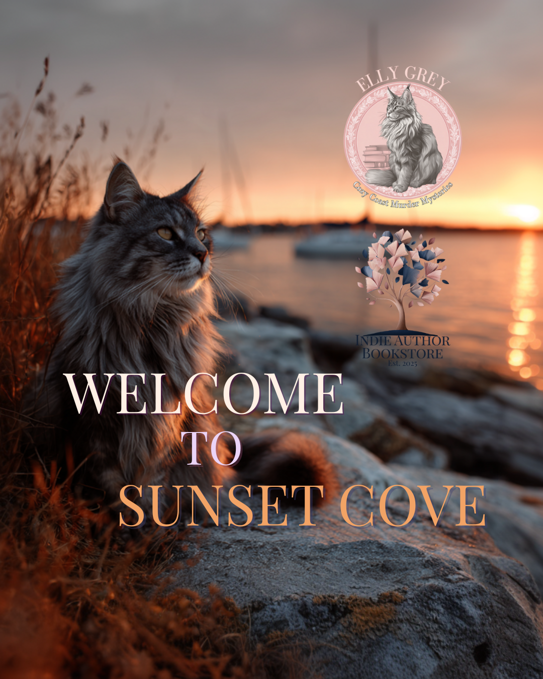 From seaside sunsets to campus corridors and cozy kitchens, Elly Grey’s stories blend small-town charm, clever twists, and one unforgettable cat who always steals the scene. Readers say it’s like visiting old friends—with a mystery (and a muffin) waiting every time.